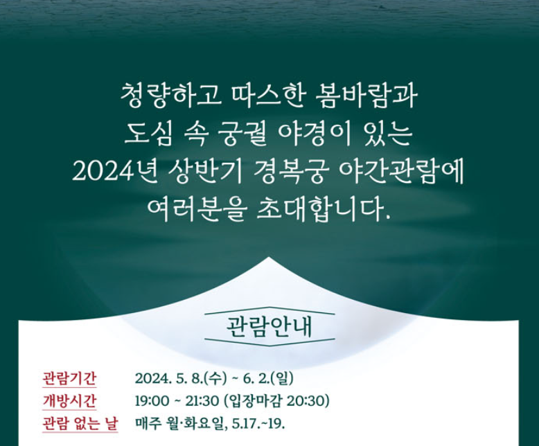 2024년 경복궁 야간개장 일정이 드디어 공지되었습니다. 작년보다 늦게 시작한 데다가 기간이 짧기 때문에 원하는 날짜에 보시려면 빨리 예매를 하셔야 가능합니다.
