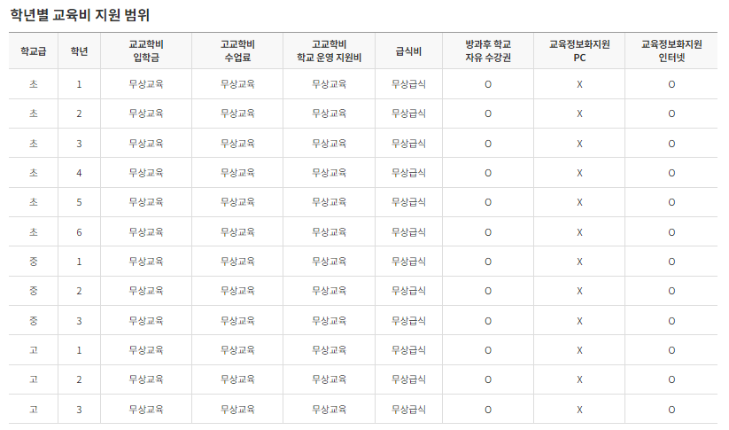 위에 알려드린 페이지(https://oneclick.neis.go.kr/nxui/index.html)에 접속하셔서 나의 지역을 선택하시면 학년별 교육비 지원범위나 지원대상을 아래와 같이 한눈에 확인할 수 있습니다.