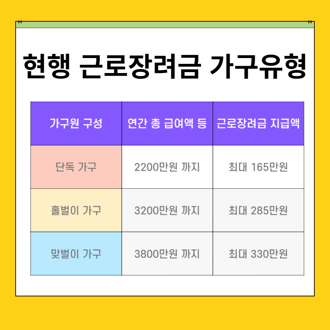 근로자와 사업자 모두 해당이 되며, 속해 있는 가구원 구성과 소득 정도에 따라 산정된 근로 장려금을 지급해 줍니다.
