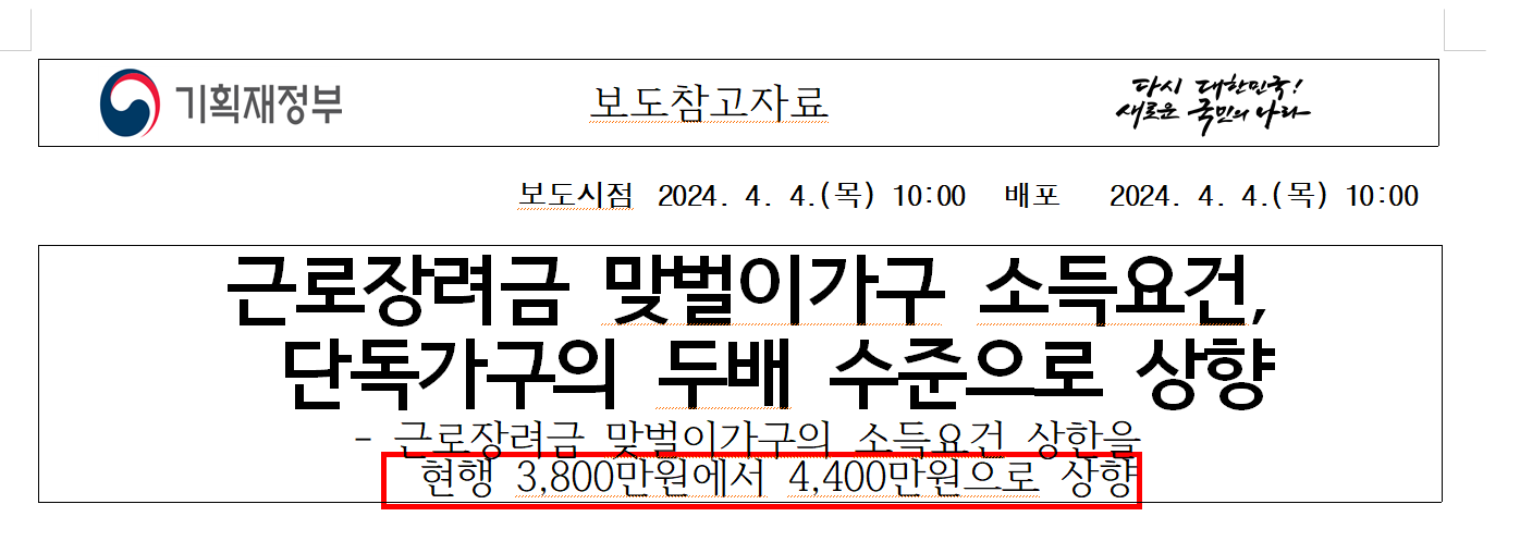 근로 장려금 지급 규모가 앞으로 역대급으로 확대된다고 합니다. 최근 기재부에서 맞벌이 가정 소득 기준을 3,800만 원에서 4,400만 원으로 확대해서 지급하겠다는 정책을 발표했습니다.