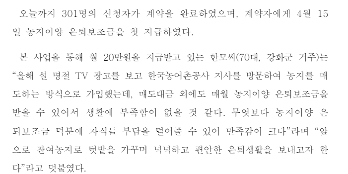 고령 농업인의 영농 은퇴 이후 생활안정을 위해 농지이양을 조건으로 월 최대 200만 원을 최장 10년간 지급합니다. 올해 신규로 도입된 본 사업이 시행 한 달 만에 엄청난 호응과 만족감을 얻고 있다고 하는데요.