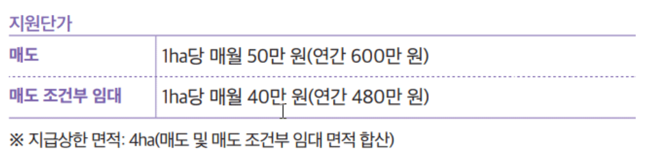 농지은행을 통해 매도 시 매도 대금에 더해 1ha 기준 월 50만 원을 지급하고, 매도 조건부 임대 시 1ha 기준 월 40만 원을 받을 수 있습니다. 이번 개편을 통해 지원단가는 약 2배 인상으로 더욱 두텁게 지원받을 수 있습니다.