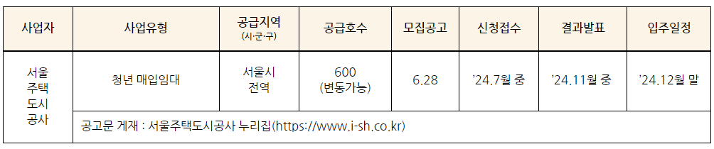 청년(600호) 가구에 대한 입지, 면적, 임대료, 입주자격 등의 정보는 아래에서 확인 가능합니다.