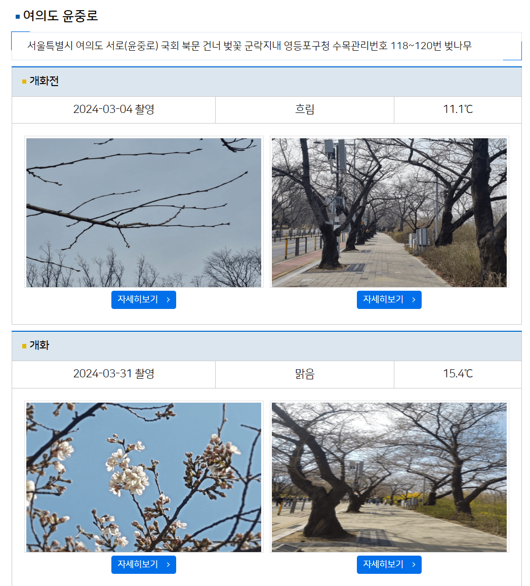 ✅ 여의도 윤중로: 개화 시작, 4월 첫둘째주 ~ 셋째 주 만개 예상