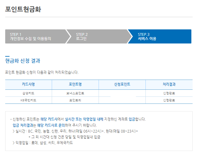 카드별 포인트도 조회할 수 있고, 포인트 현금화도 바로 가능합니다.