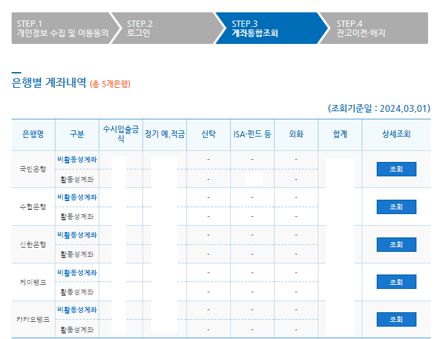 계좌정보 통합관리시스템 접속 -> 개인정보 수집 동의 및 로그인 -> 조회