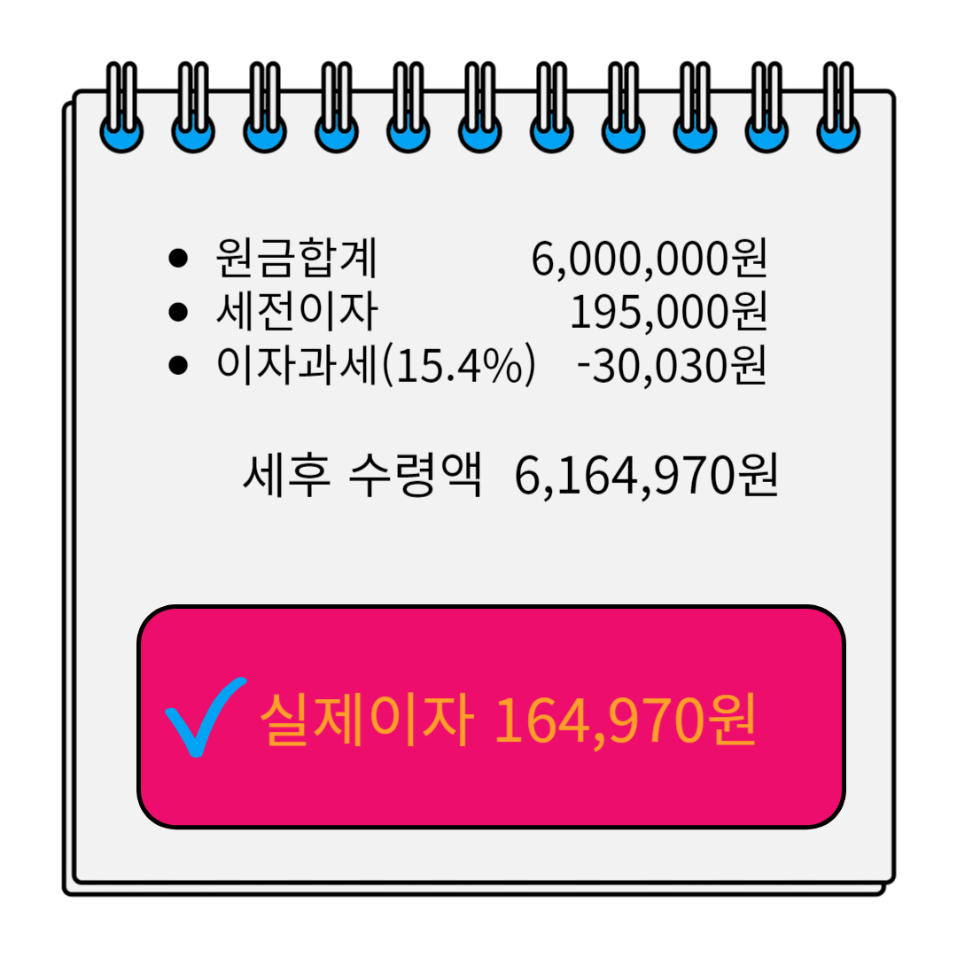 세전이자는 195,000인데 여기서 이자과세 15.4%를 떼면 실제 수령이자는 약 16만 5천 원 정도입니다.