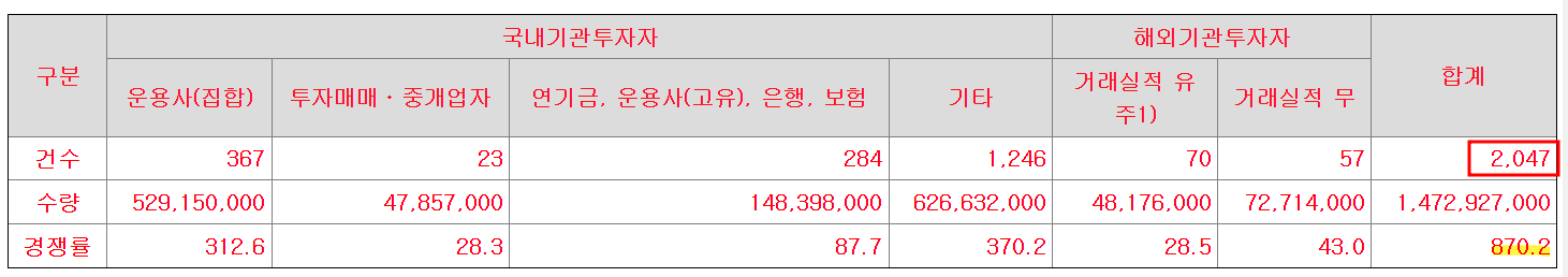 총 2,047곳이 참여하여 870.2대 1로 기업 수요예측 결과 상당히 좋은 편입니다.