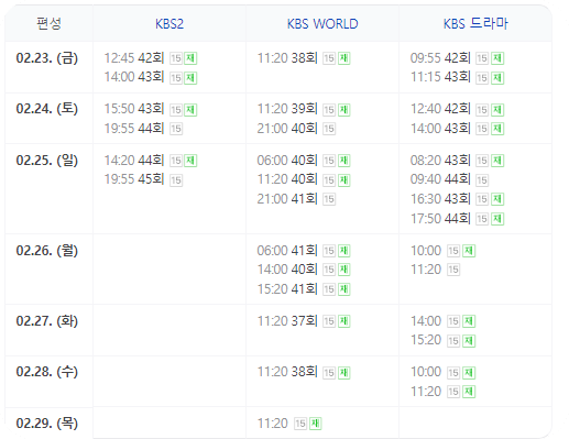 재방송 방영 시간은 다음과 같으며, 예정된 시간에 티브이로 보시거나 인터넷 모바일로도 가능하니 상황에 맞게 시청하시면 되십니다. 재방송 방영은 다음과 같이 kbs2채널, kbs world채널, kbs드라마 채널로 나뉘어 방영됩니다.
