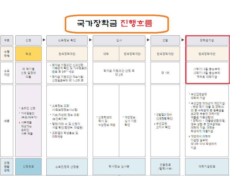 국가장학금은 신청 → 가구원 정보제공 동의서 등 필수서류 제출 완료 하시면 사회보장정보시스템을 통해 한국장학재단에서 소득 및 재산조사를 진행하게 되고, 소득인정액 및 학자금 지원구간이 확정되는데 지원구간이 확정되면 통상적으로 SMS로 개별통지를 해준다고 합니다. 이 과정만 해도 대략 8주 내외 정도 시간이 소요된다고 하는데요. 그 이후 최종선발이 확정되어도 장학금 지급까지 대략 1~2개월 정도의 시간이 소요되니, 진행되는 동안에는 계속 관심을 가지고 진행상황을 확인해 보셔야 할 것 같네요.
