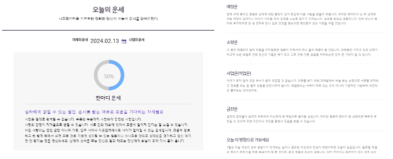 전반적인 운세를 퍼센티지로 나타내 주며, 총평과 애정운, 소망운, 사업운(직업운), 금전운, 오늘 이 방향으로 가보세요 카테고리로 나누어 안내해 줍니다.