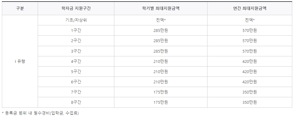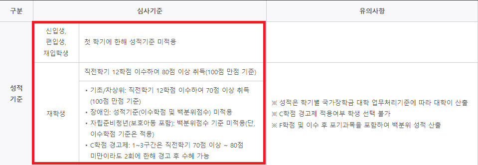 신입생과 재학생 기준이 다르고, 재학생 중에서도 소득구간, 장애인 여부 등 기준이 일부 다르니 아래 표를 확인해 보시길 바랍니다.