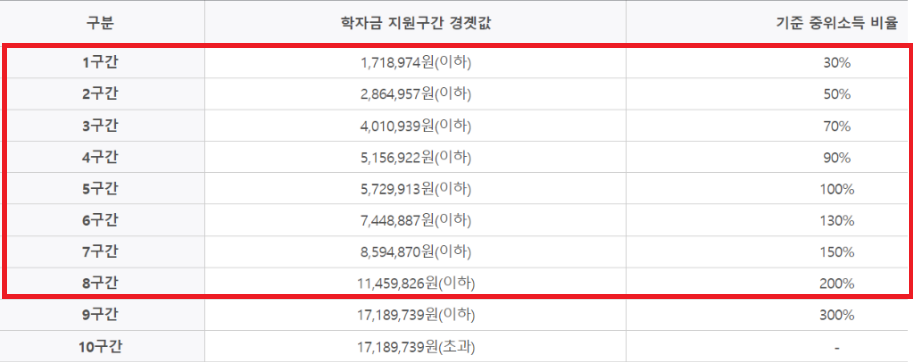 아래 표에 기재된 것처럼 학자금 지원구간별로 지원금액이 다릅니다.