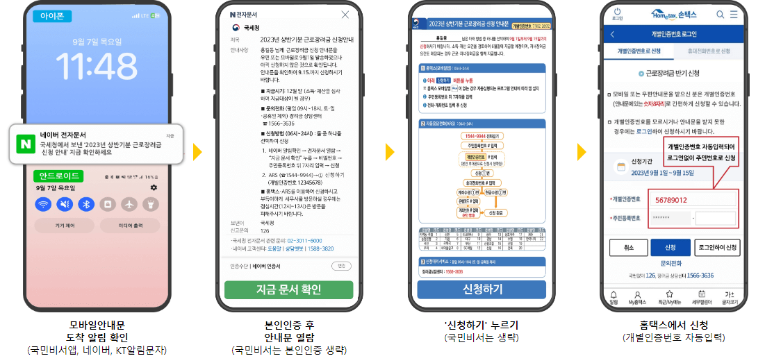 홈택스 모바일앱 실행 → (자주 찾는 메뉴) 반기신청 또는 신청/제출 → 근로장려금 반기신청 → 신청하기 → '주민등록번호 7자리'와 '개별인증번호' 입력 → 신청