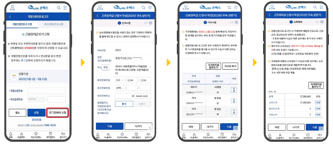 신청/제출 →근로장려금 반기신청 → 신청하기 → 로그인하여 신청 → 인적 가구사항 → 소득명세 작성 → 전세금 명세 → 계좌번호 작성 → 신청확인 및 전송